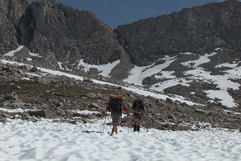 Finally, the hikers arrived in the mountains of the Sierras. The environment changed as they climbed. In the mountains the weather was cold with hail and thunderstorms. The trail was rocky and crossed steep snowfields. The resupply points were far apart leaving the hikers to decide whether to carry heavy packs (with lots of food) or walk high mileage days.