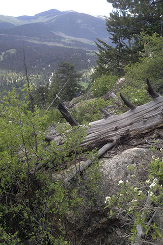After completing the 7 pitch (rope lengths) route, we coiled the rope, packed the gear, and started down the regular descent off the backside of MacGregor. It was supposed to be a hike that would lead us down a gully on a faint path and then over to the base of the cliff. The descent was supposed to be easy, but oh, we were wrong. Due to the pine beetle infestation, the once navigable gully was criss-crossed with downed trees.
