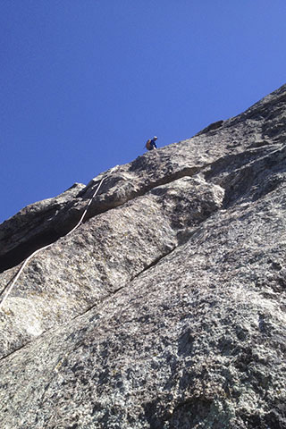 On MacGregor Direct, Mark led up through thin corners to an easier than expected overhang, and then to the top. It was a fun climb. As we climbed we kept seeing bolts that went up the center of a face to our left. The route seemed as if it was being used as both a climbing route and as a multi-station rappel. We discussed why anyone would want to rappel down the slab. The chances of getting your rope stuck was great on the less than vertical slope.